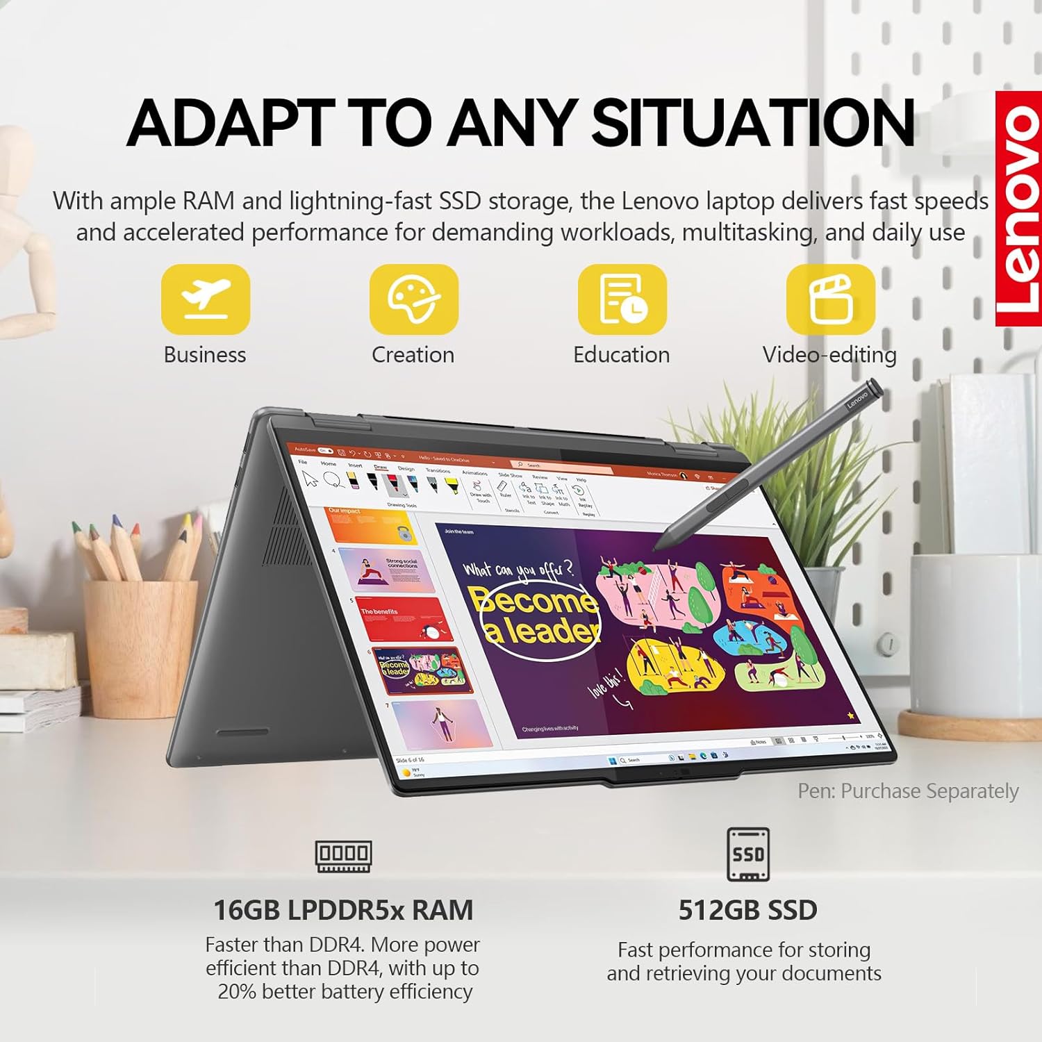 LIGHTNING SPEED: Enjoy seamless multitasking with 16GB high-bandwidth LPDDR5x RAM, delivering faster, more efficient performance than DDR4. The Lenovo 2-in-1 laptop offers 512GB SSD storage, providing up to 15x faster speeds than traditional HDDs. Powered by a 12-core processor, this 360 laptop notebook pc ensures exceptional speed, reliability, and value for both work and play
