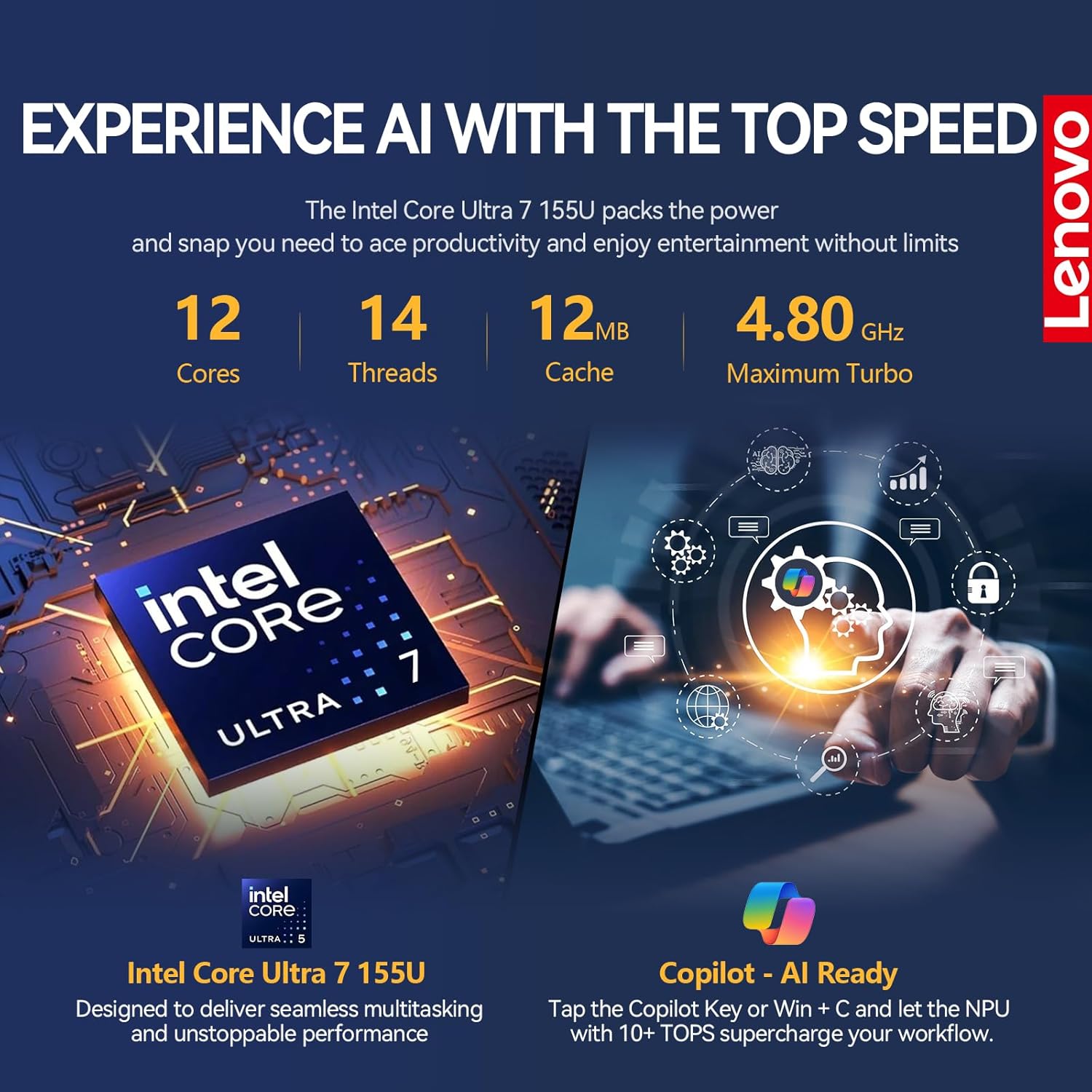Intel Core Ultra 7 155U (12 cores, 14 threads, up to 4.8GHz) – enables extreme multitasking and superfast computing for incredible productivity
